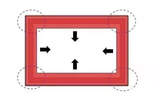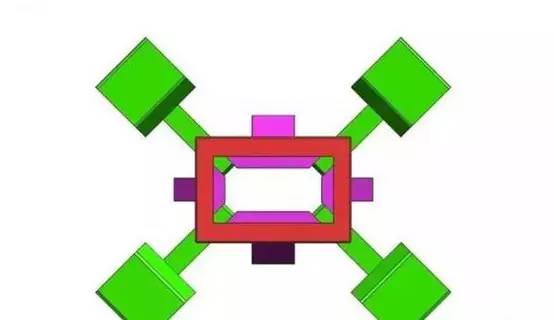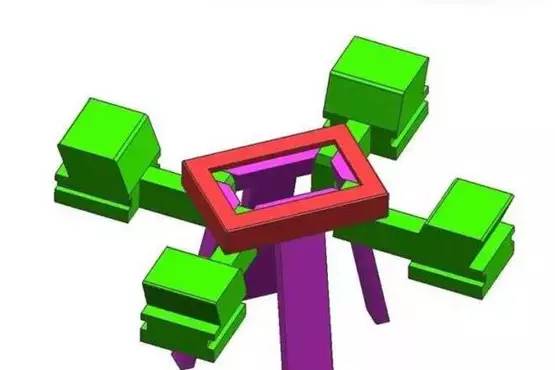 碰到此類產品,我們首先會考慮能不能做斜頂,但通過分析,做斜頂4個角落位置的倒扣無法脫離(箭頭方向做斜頂) 2.方案 斜頂無法完全脫倒扣,我們只能考慮能否用斜頂+內滑塊的方式進行設計。如下圖所示,綠色部件為內滑塊,粉紅色部件為斜頂。