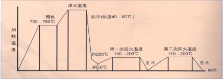 回火:加熱至150-200℃或者500-550℃,在此溫度中停留,然后在靜止空氣中冷卻,回火溫度在150-200℃;對(duì)韌性方面注重及后需要線切割加工WED或放電加工EDM時(shí),回火溫度應(yīng)為500-530℃。