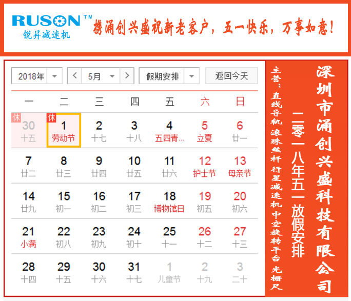 一、放假時(shí)間為2018年4月29日至2018年5月1日,共3天,于2018年5月2日正式上班。上班后,我公司的產(chǎn)品(直線導(dǎo)軌、滾珠絲桿、行星減速機(jī)、中空平臺、光柵尺)將正常供貨!