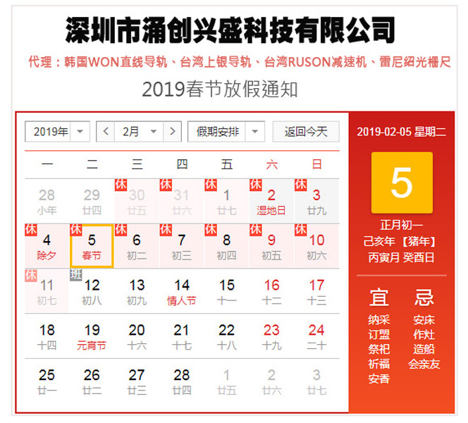 深圳市涌創(chuàng)興盛科技有限公司2019春節(jié)放假通知,公司是一定經(jīng)營直線導軌,減速機,光柵尺,直線電機等自動化設(shè)備供應廠家!