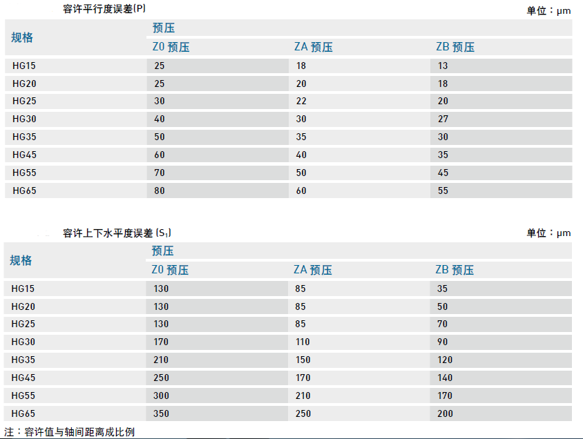 HG系列為圓弧兩點(diǎn)接觸式直線導(dǎo)軌,其自動(dòng)調(diào)心的特性可以吸收安裝面的些許誤差而不影響直線運(yùn)動(dòng)的順暢性;下表中注明了安裝平面的容許誤差值:
