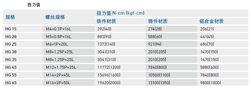 安裝導(dǎo)軌時是否鎖緊貼平基準(zhǔn)面影響直線導(dǎo)軌精度甚劇,因此為達(dá)到每顆螺絲都能鎖緊的目的,建議使用下列扭力值鎖裝配螺絲。