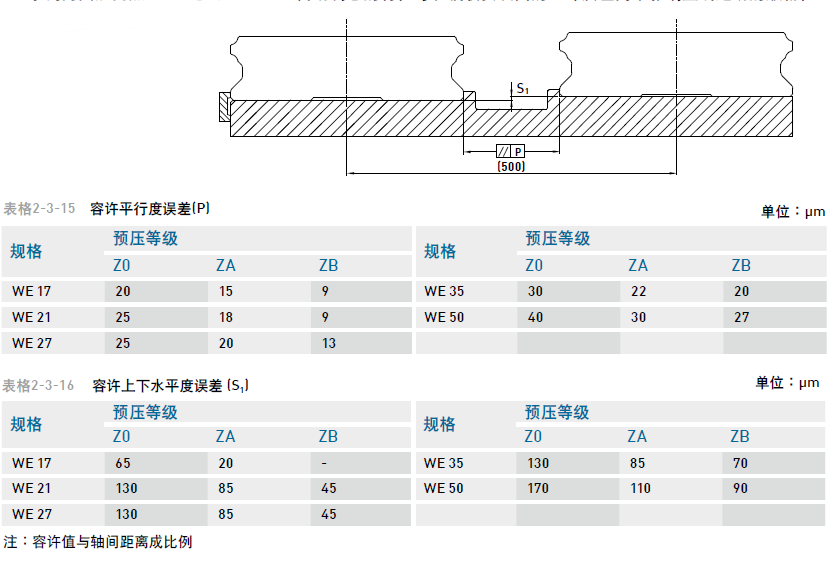 WE系列為圓弧兩點接觸式直線導(dǎo)軌,其自動調(diào)心的特性可以吸收安裝面的些許誤差而不影響直線運動的順暢性;下表中注明了安裝平面的容許誤差值: