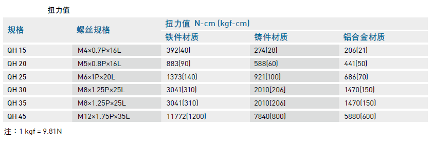 安裝導軌時是否鎖緊貼平基準面影響直線導軌精度甚劇,因此為達到每顆螺絲都能鎖緊的目的,建議使用下列扭力值鎖裝配螺絲。