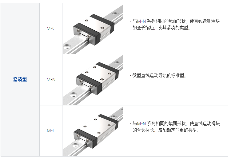 體積小、輕量化,滑塊主體的一部分采用了樹脂材料,重量減少約20%,特別適合小型化設(shè)備使用。不銹鋼材質(zhì)之線性滑軌,包含滑塊、滑軌及其它金屬配件如鋼珠、保持器等,皆使用不銹鋼材質(zhì),具備防銹的特性。采用哥德型四點接觸設(shè)計,可承受各方向負荷,具備剛性強,精度高等特性。有鋼珠保持器設(shè)計,在精度允許下具備互換性。